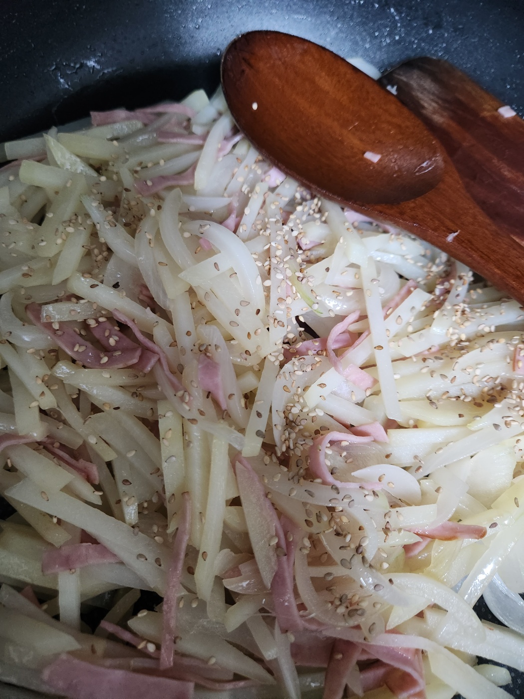 - 베이컨, 감자, 양파가 모두 익으면 참기름과 통깨로 마무리합니다.